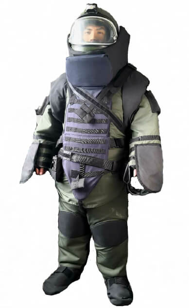 排爆服的材料由防火阻燃材料和最新的芳綸制成,防彈面罩材料為有機透明材料,防彈插板材料為陶瓷復合材料板。