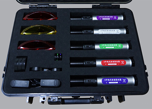 1. 光源主機 5把(白光、紫光、藍光、綠光、紅光各1把)2. 電池組 5組 (通用)